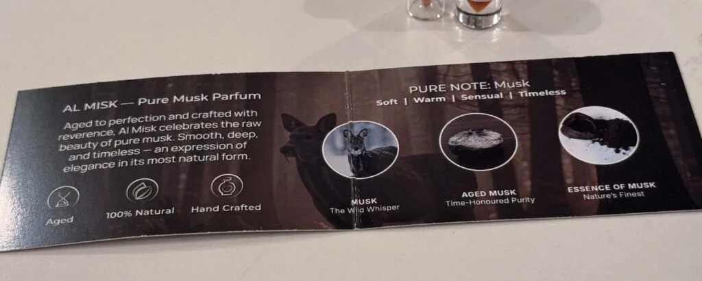 Al Misk – The Attar concentrated, intimate, true to the classical form. A slow unfolding warmth that rests close to the skin. Animalic softness matured into velvet depth. A fragrance that whispers rather than declares.